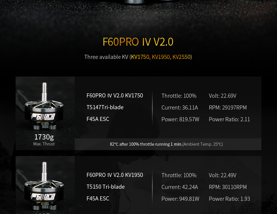 The F60 Pro IV has been upgraded to V2.0. This motor continues the lineage of great FPV racing motors. The Pro IV provides more thrust and increased durability compared to its predecessor.