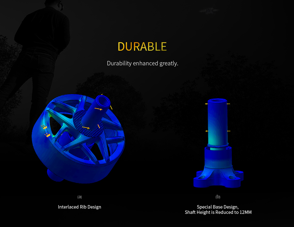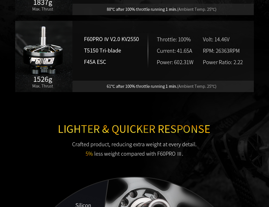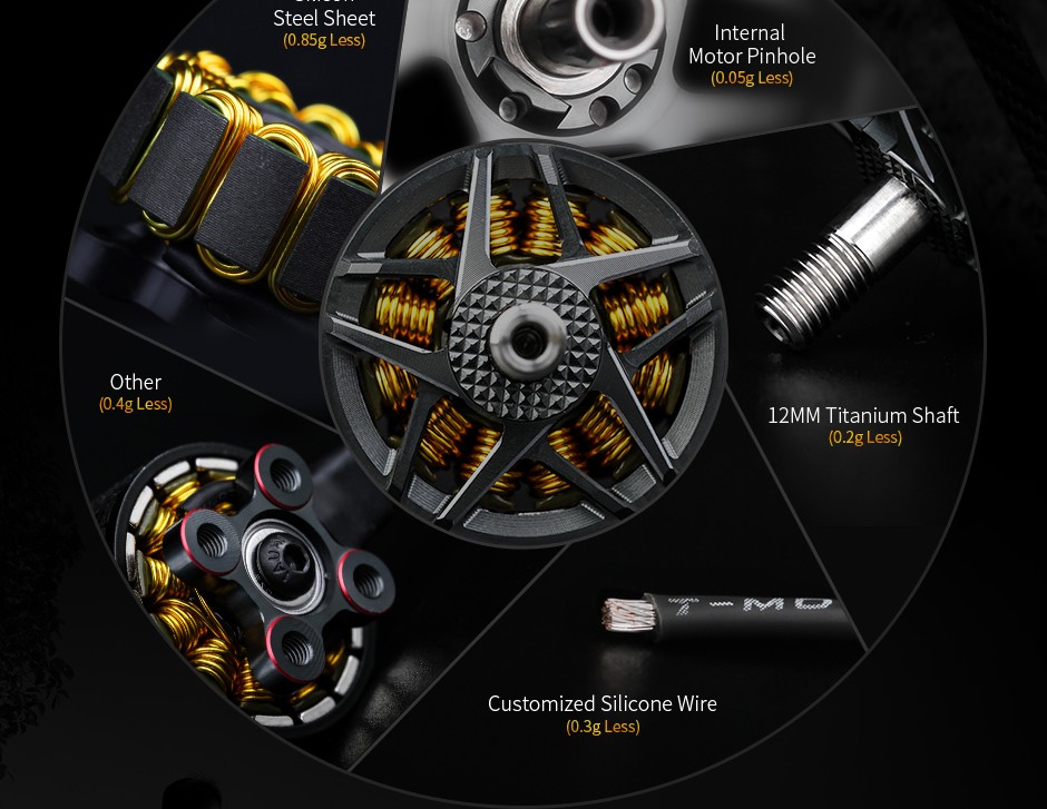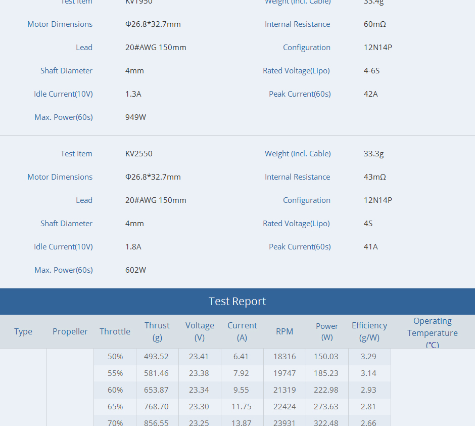 The 1950KV is equipped with high-temperature silver-core windings able to withstand up to 88C, after 100% throttle running 1 min, while the 2550KV can withstand 61C after 100% throttle running 1min. The overall stability of the motor has been enhanced.